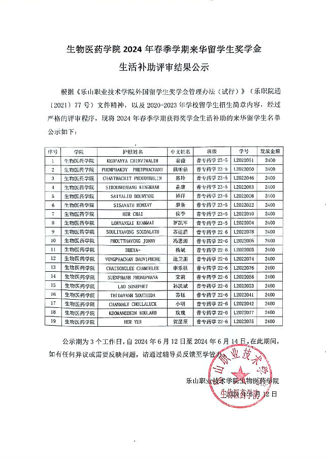 根据《BV伟德官方网站外国留学生奖学金管理办法(试行)》(乐职院通〔2021〕77号)文件精神,以及2020-2023年学校留学生招生简章内容,经过严格的评审程序,现将2024年春季学期获得奖学金生活补助的来华留学生名单公示如下: