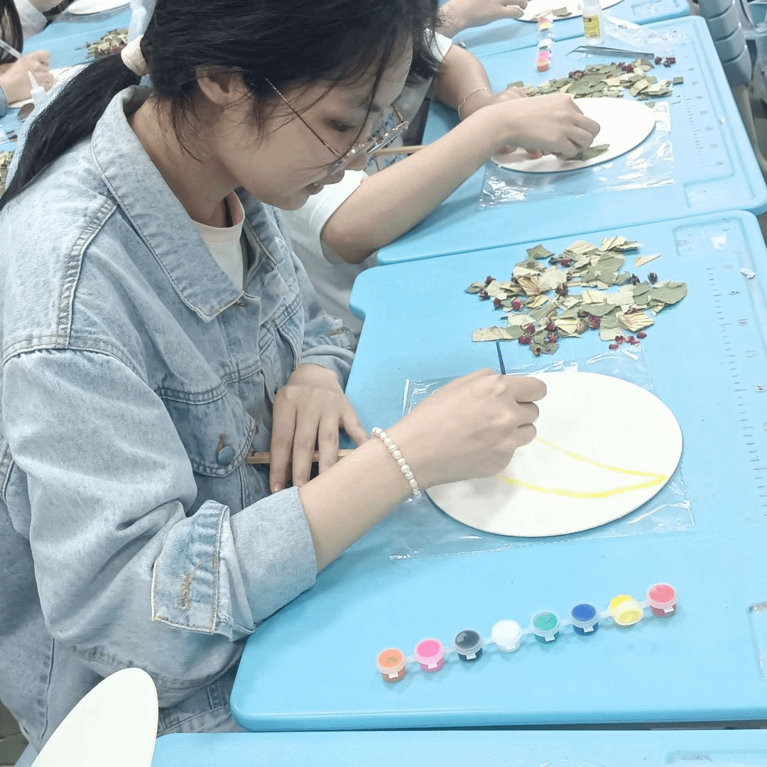 活动开始前,工作人员已备齐干玫瑰、荷叶等中药材及团扇、胶水等制作工具,并有序组织参与人员完成签到。活动过程中,主讲人黄靖带领参与人员走进小暑节气,为大家科普小暑节气的文化内涵及中草药的药用价值,如赏荷活动、食用苦味食物、避暑消夏活动等。在介绍避暑消夏活动时提到,小暑时节人们会制作或购买手工团扇,用以扇风纳凉,增添生活情趣。随后,在工作人员的指导与参与人员创新思维的运用下,大家将中药材创意拼贴于素面团扇之上。扇面制作过程中,参与人员全神贯注地装饰扇面,胶水的粘合、草药的排列、色彩的搭配,每一步都考验着耐心与审美。中药材本身的色彩与颜料相碰撞,成为别具风格的画卷,呈现在扇面之上。