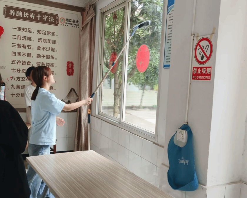 6月21日上午,30名生物医药学院同学走进乐山顺江养老院,开展“爱驻夕阳,关爱老人”活动,为老人们送去温暖与关怀。活动伊始,负责人将同学们分为两个小组,有序推进活动开展。一组同学化身“清洁小卫士”,手持清洁工具,认真仔细地擦拭每一扇窗户,用实际行动为老人们打造整洁舒适的居住环境。另一组同学则围坐在老人身边,成为老人们的“贴心听众”。他们耐心地聆听老人们讲述人生故事,时而点头回应,时而互动微笑。同学们用真诚的陪伴,让老人们感受社会的关爱与温暖。
