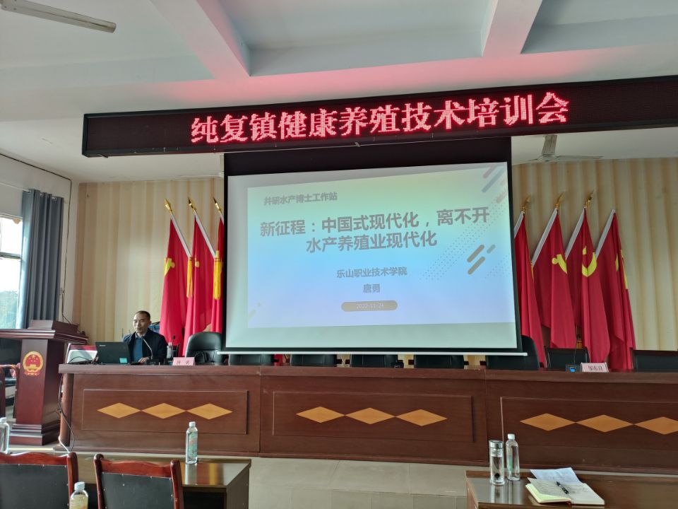 11月24日上午,唐勇博士到井研县纯复镇水产博士工作站开展水产养殖技术培训,培训会在井研县纯复镇人民政府四楼会议室举行,纯复镇各村水产养殖业主代表40余人参加培训会。