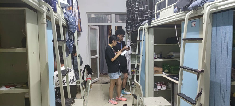 为了了解学生寝室内部环境、安全状况。2021年9月16日晚20:00,在值周老师卢妮娜的带领下,纪检部配合生活部到男生寝室2B5楼寝室检查寝室内务情况,参与此次查寝的有纪检部生活部各两位干事。